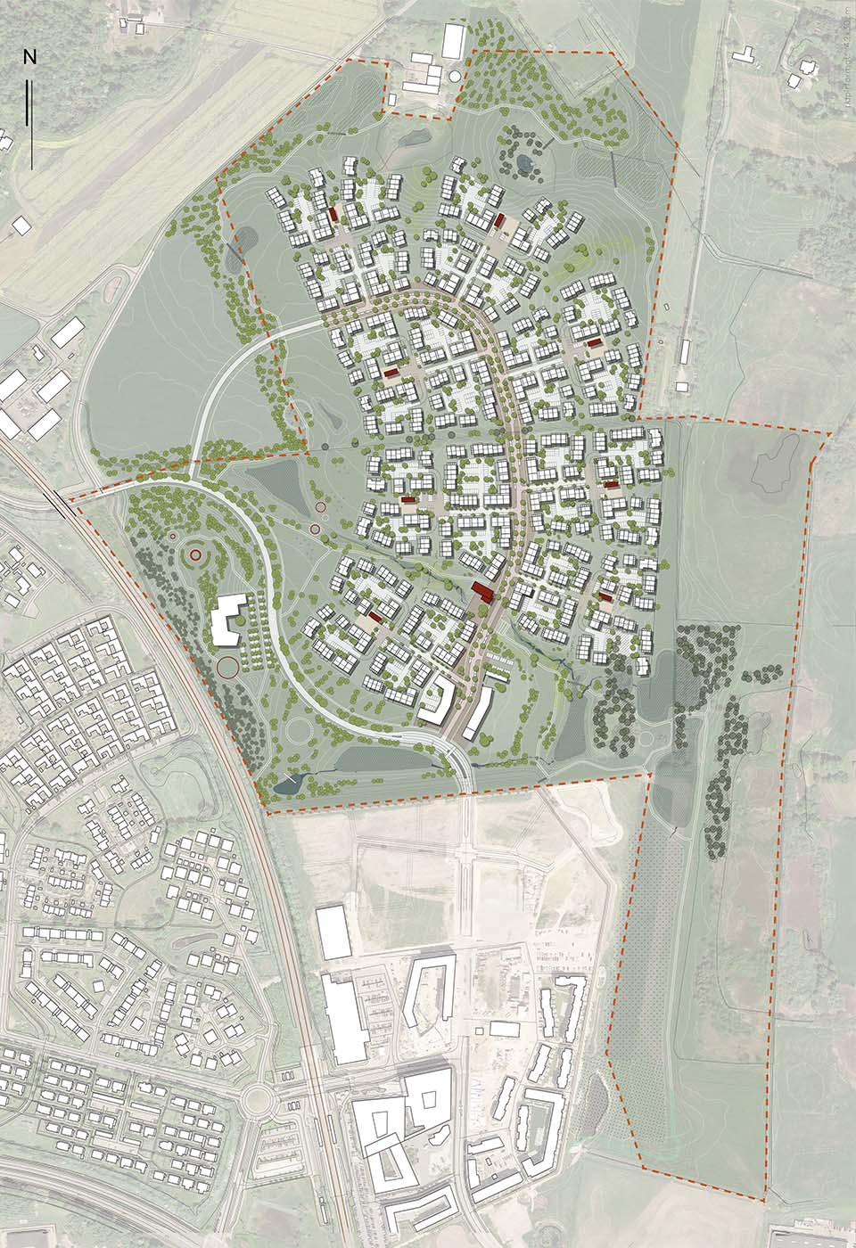 Den nye bydel balancerer dialogen mellem det bymæssige og det landskabelige, og får sin helt egen identitet. Her har vi udviklet et koncept, som er robust overfor en langsigtet udbygningstakt, så de enkelte etaper er fuldt funktionsduelige fra starten, og arkitektonisk og landskabeligt kan tåle at ’stå alene’.