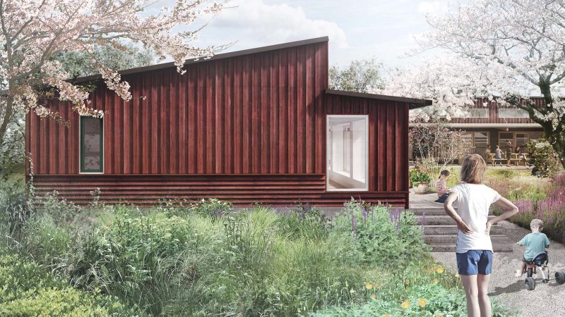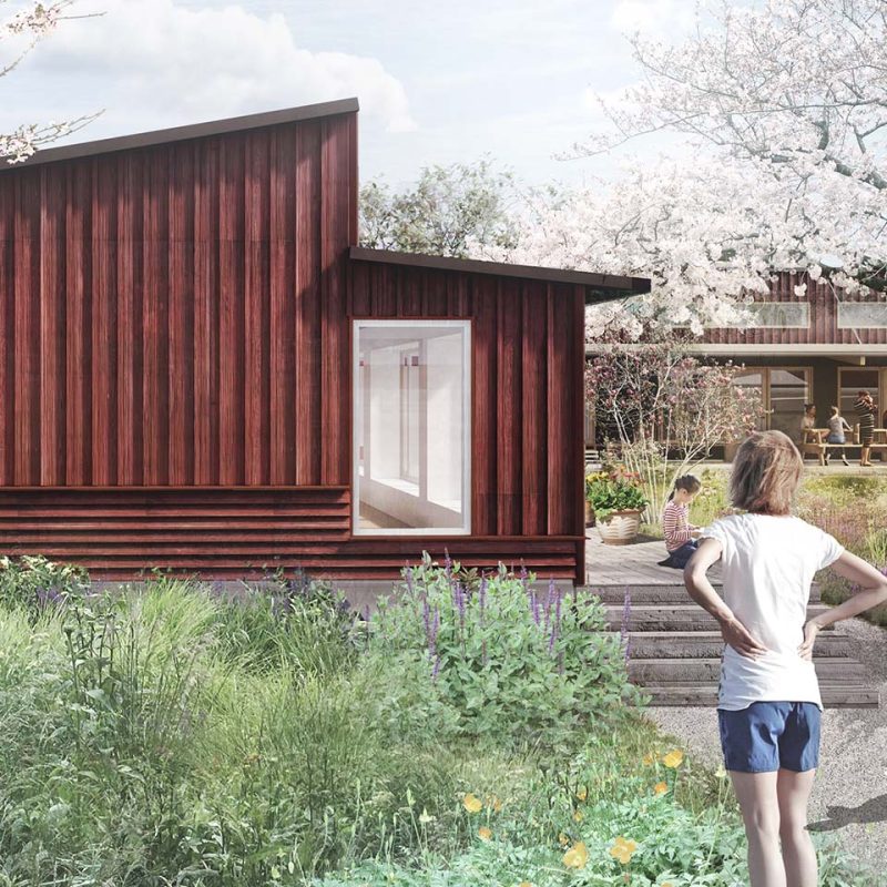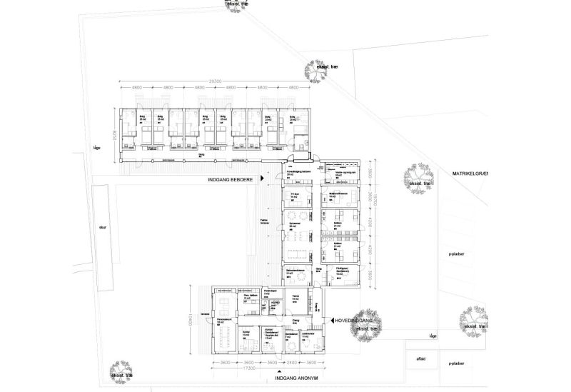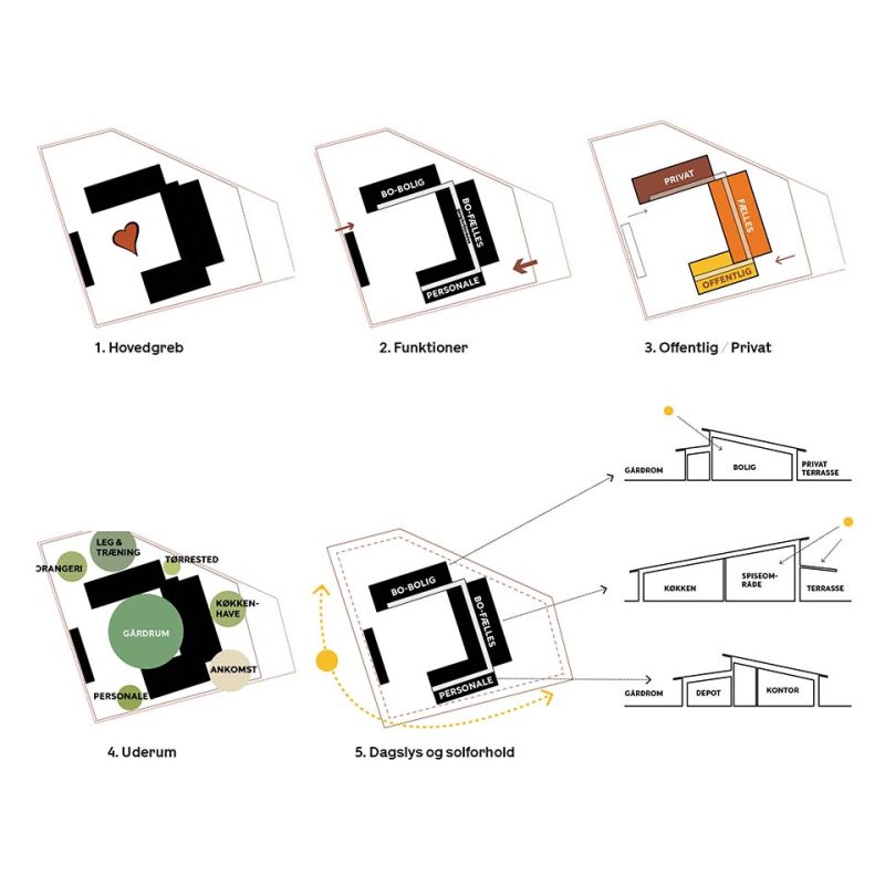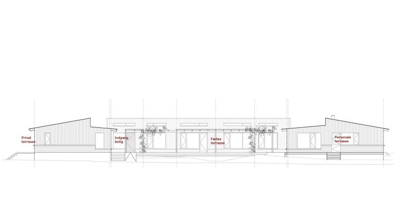 Programmets tre hovefunktioner placeres på grunden i én etage og skaber et trygt og omsluttende uderum. Et redskabs- og cykelskur udgør den fjerde længe. Grebet er pragmatisk og robust.