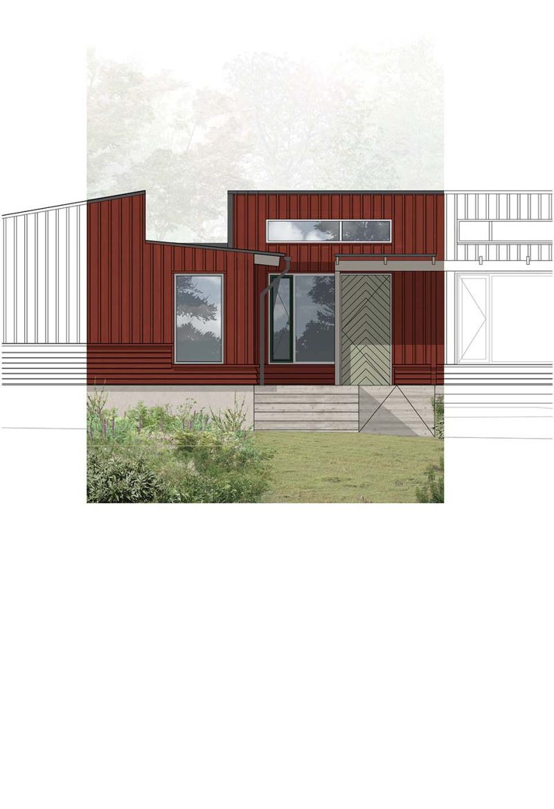 Facaderne beklædes med rødmalet træ under store tagudhæng, hvilket giver en god konstruktiv træbeskyttelse. Træbeklædningen udføres som en blanding af vandrette klinklagte brædder under vinduer og lodret ‘1 på 2’ beklædning herover.