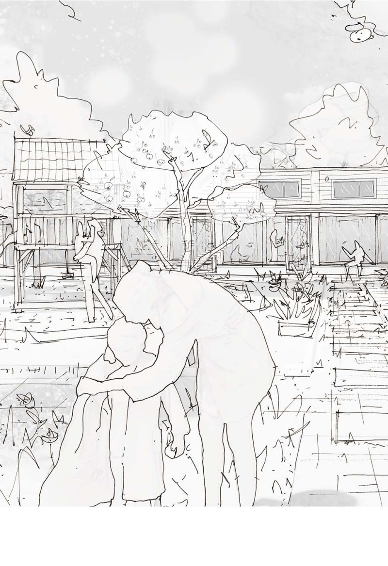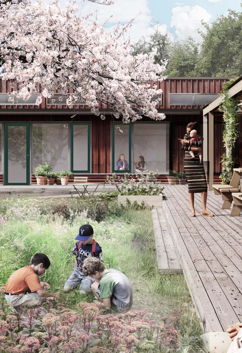 Ved at hente inspiration fra en traditionel Bornholmsk firlænget gård, har vi søgt at skabe en bygning, der favner en tryg gårdhave – hvor man trygt kan lade børnene lege, mens man laver mad, vasker tøj eller bare sidder.