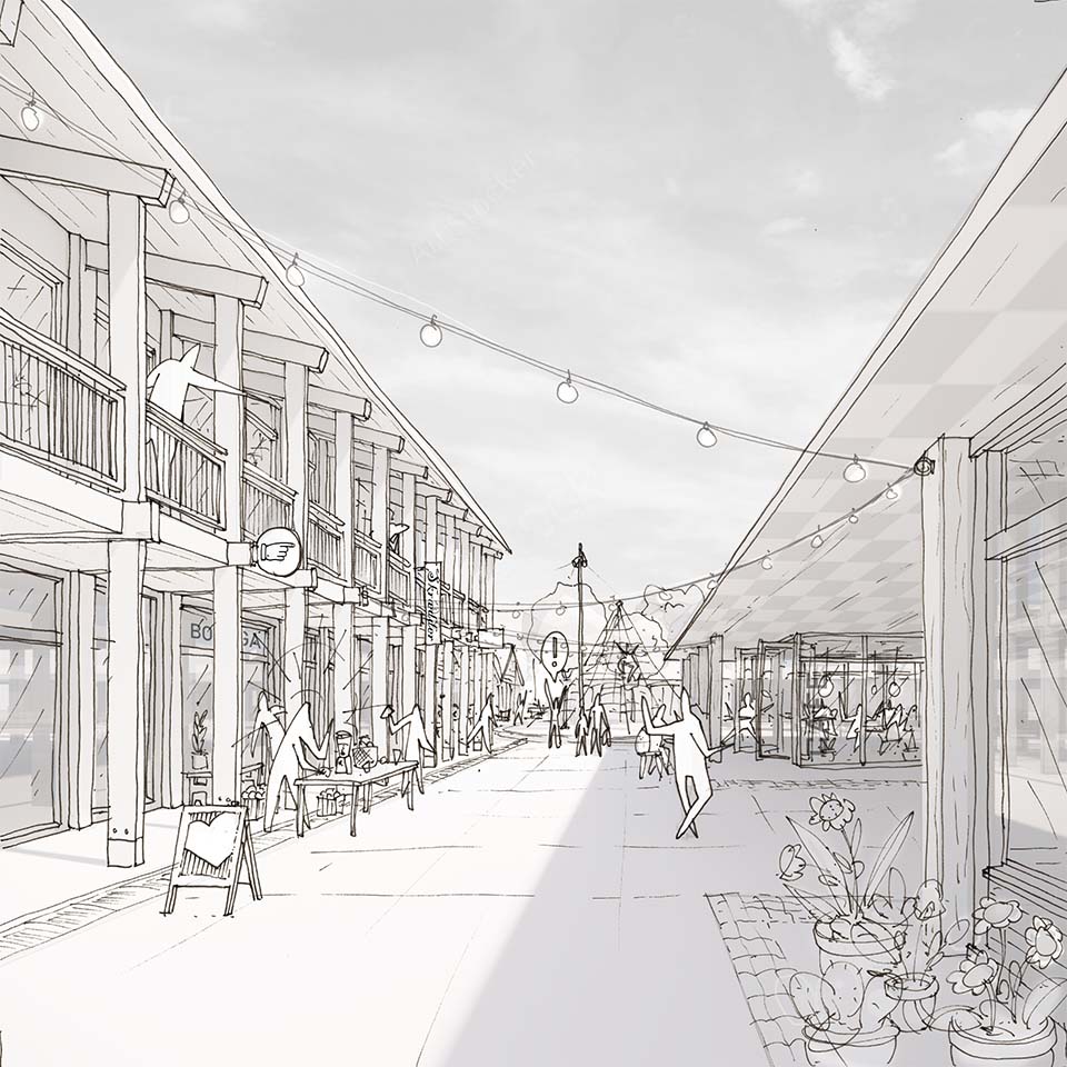 Strædet, der i dag forbinder Vejleåparkens tre store gårdrum og giver adgang til institutioner og funktioner i de store landskabsrum, skal understøttes og lokalcentret skal fremtidssikres, så det fremadrettet kan rumme det lokale hverdags-, forenings- og erhvervsliv. Nye belægninger, bedre belysning og åbne inviterende facader skal løfte området. Vi forslår en ny og mere tydelig landskabelig forbindelse, der kobler de nordlige og de sydlige dele af gårdrummet.